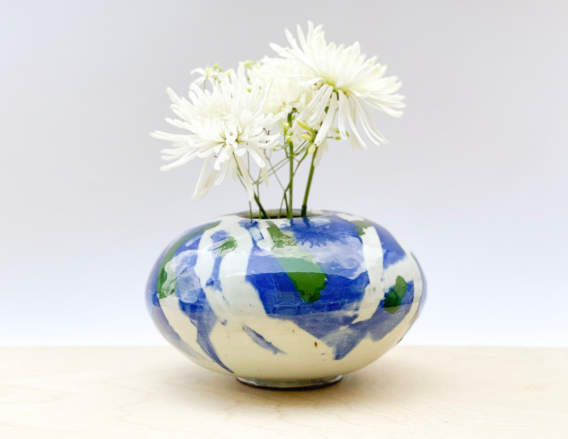 Belly Vase - this one of a kind, handmade stoneware vase, is a an indigo blue with dark green accents. It is a stunning statement piece that will make itself right at home whatever the decor.