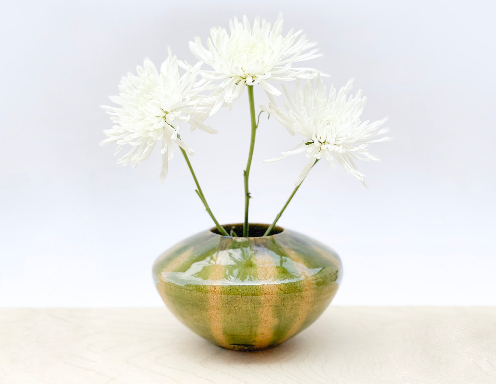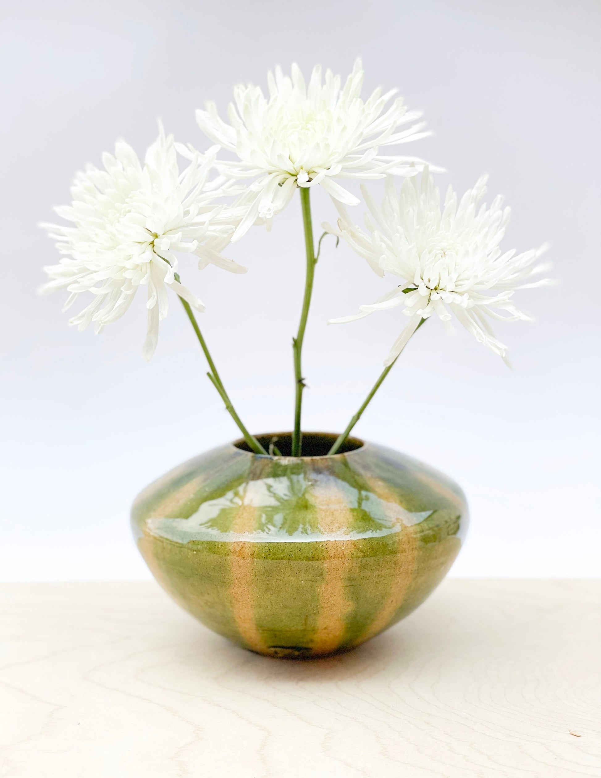 Belly Vase - this one of a kind, handmade stoneware vase, has warm green and beige colors that will complement any design style. Soft bottle green color is perfect for any neutral palette as well.