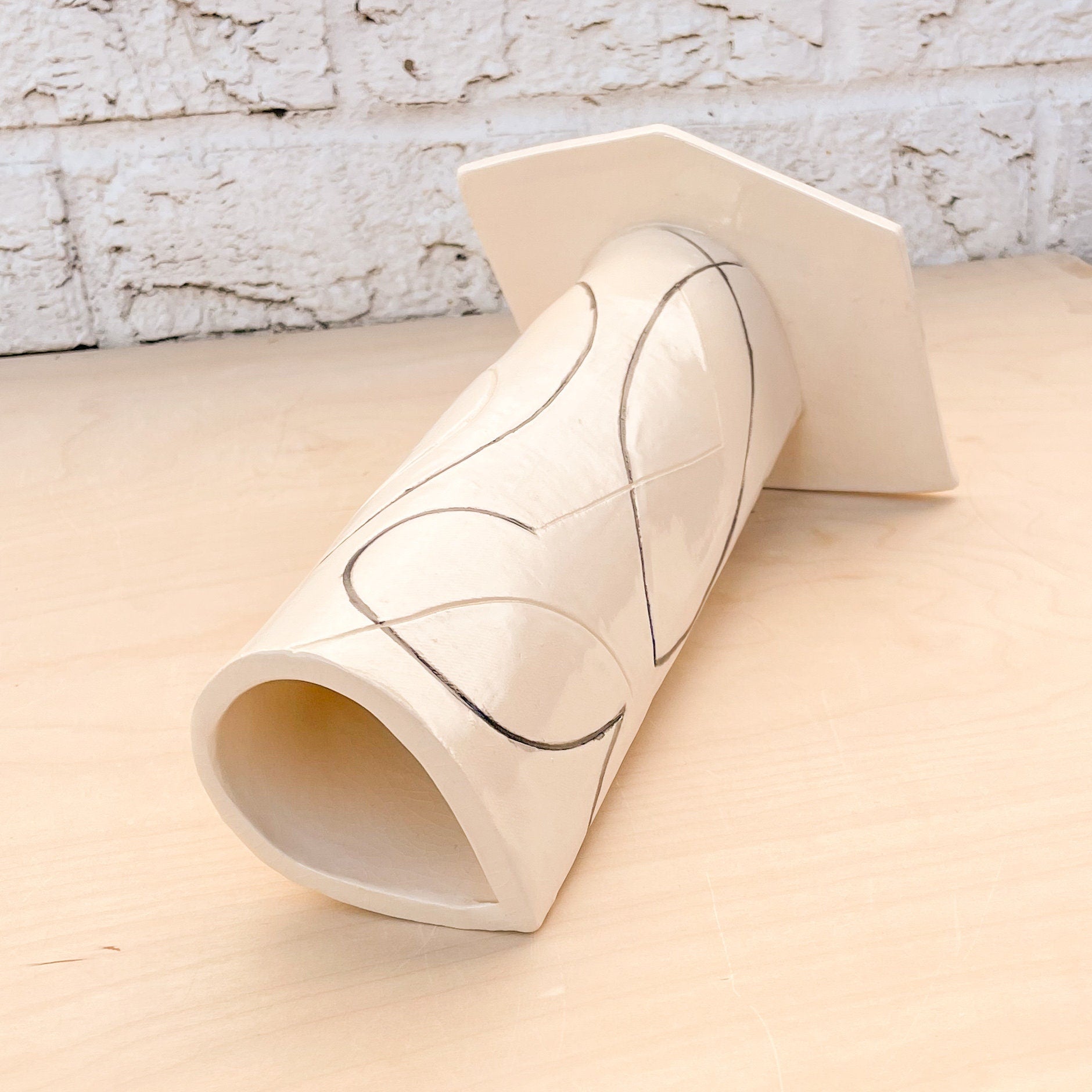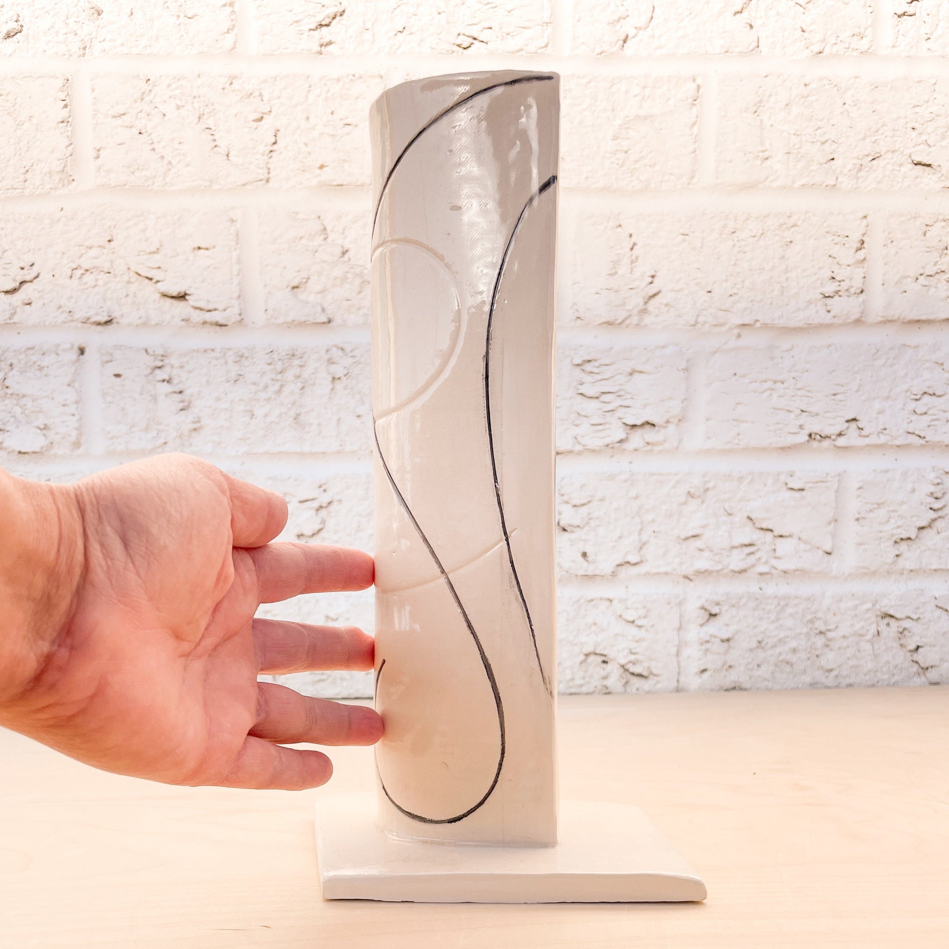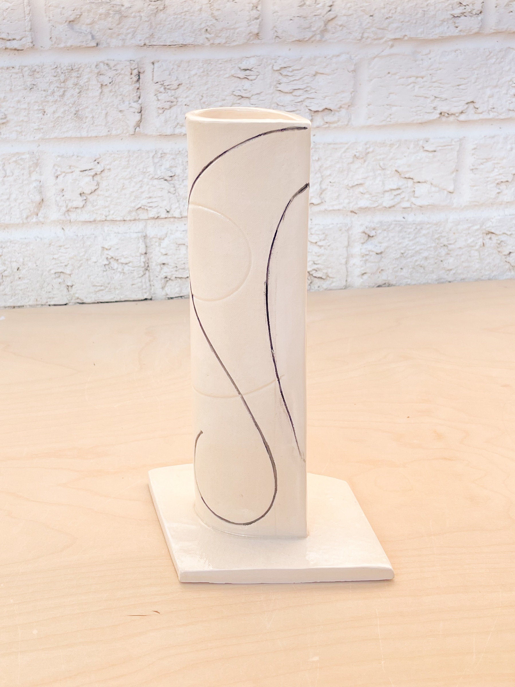 Mid Century Tall Bud Vase - this one of a kind, handmade stoneware vase has a wide base that will resist any cat's attempts to knock it over! Gorgeous as is, can also be used as a utensils holder. Or simply gift it to that friend that loves minimalist modern design and has been looking for that perfect white modern vase!